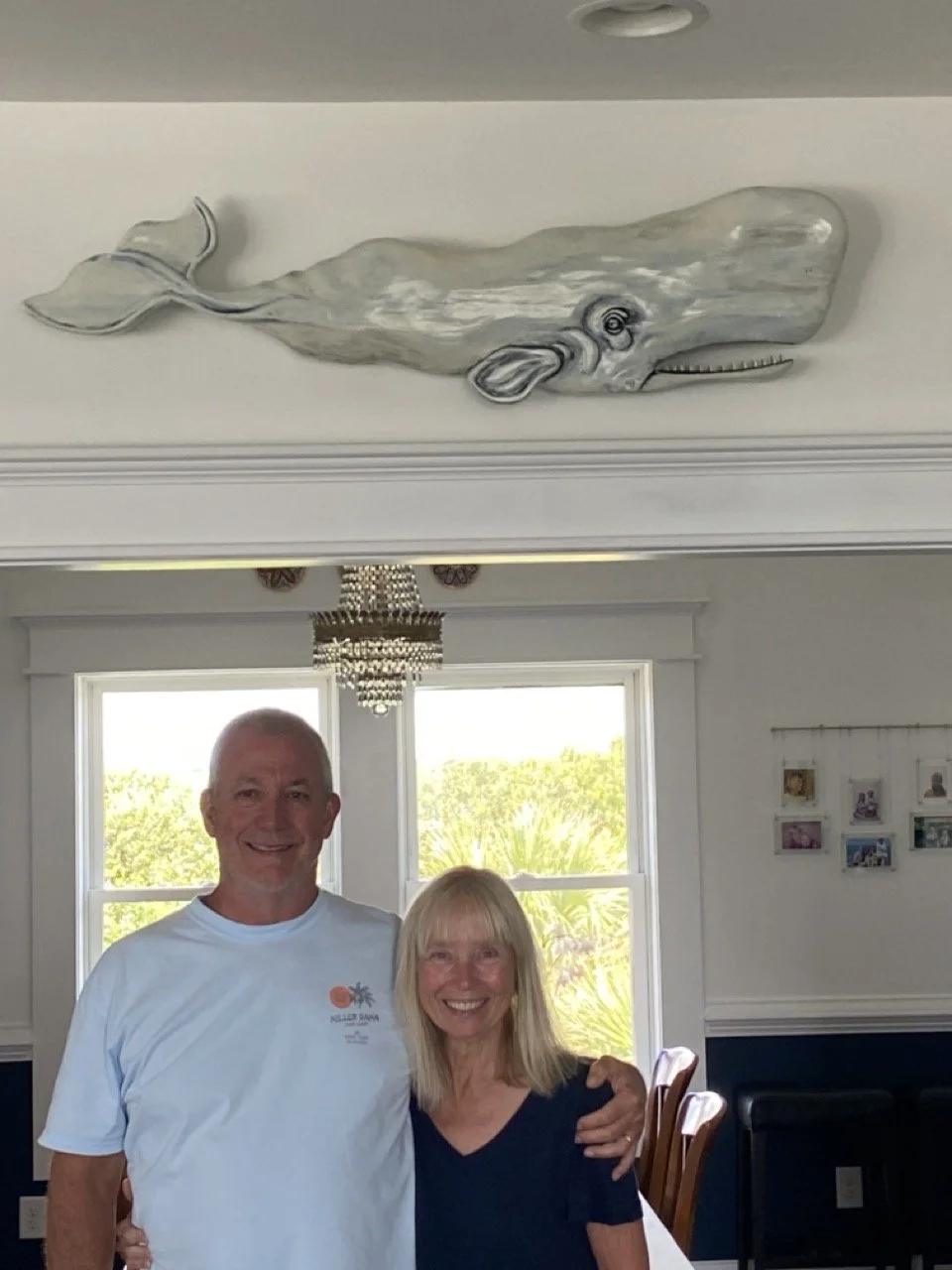 “What an overwhelming surprise when we received our whale named “Fitz” from Swell Whales. We expected it to be good but it was beyond exceptional. The craftsmanship and artisan focus put into this piece is clearly evident. The four feet of elegance is proudly displayed in our kitchen and admired by all who visit. The depth of colors and attention to detail, all the way to the hard carved teeth and eye, are amazing. Our original intent was to hang this outside of our beach house. Once we received the carving we were blown away at how beautiful it was and decided to hang it inside to admire, preserve its beauty and for all to see. We could not be any happier with our whale “Fitz””